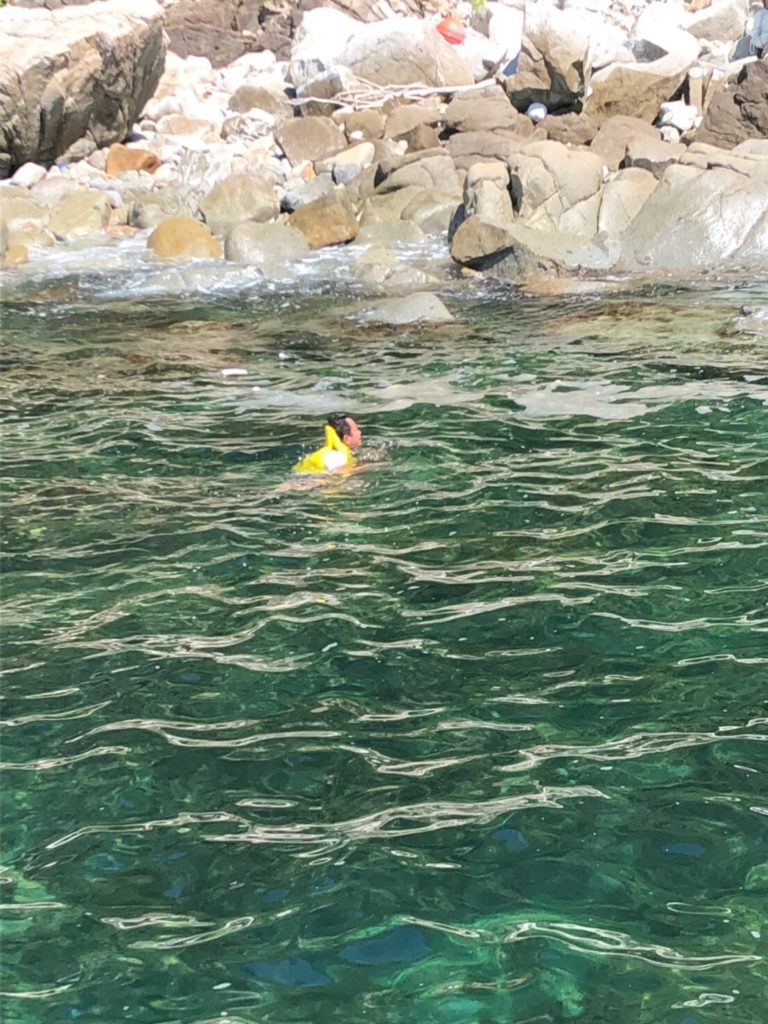 船で島へ行き、着くなり海へ落としたり落とされたり飛び込んだり。。(^O^)/